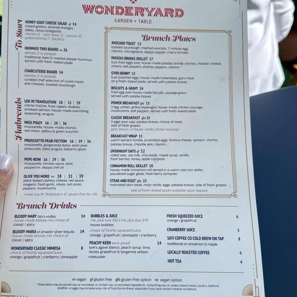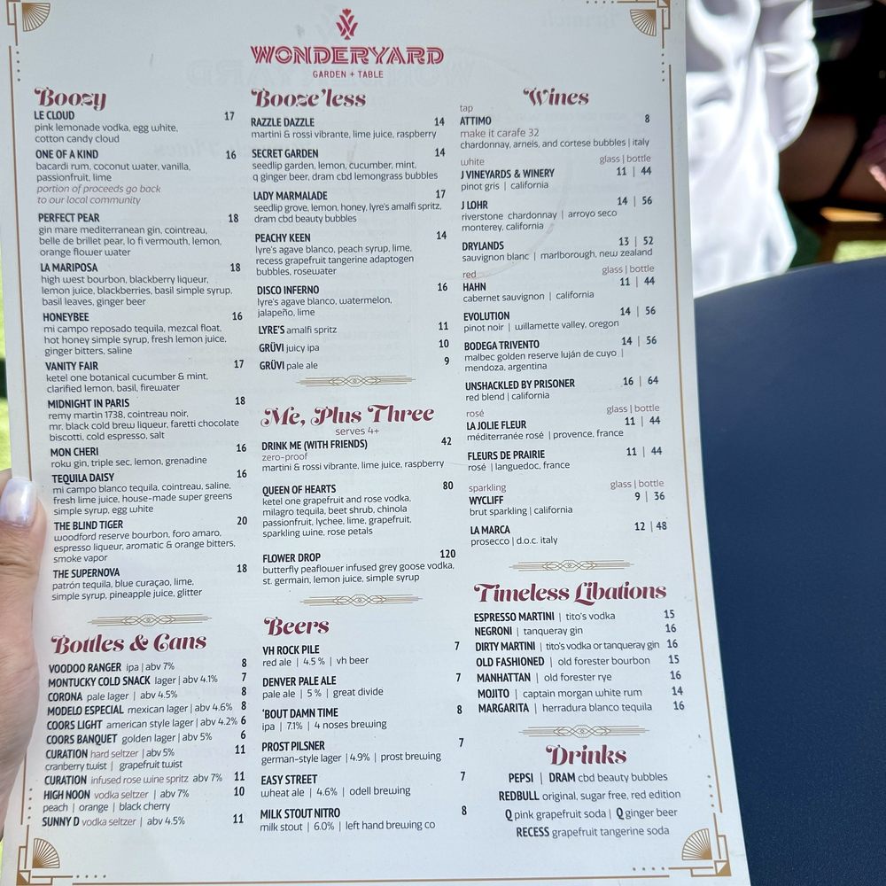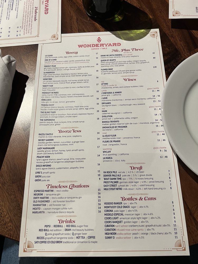 Wonderyard Garden + Table, located in Denver, offers a trendy, upscale bar experience with outdoor seating and a vibrant atmosphere. The menu features Mediterranean-inspired dishes like Burrata with cherry tomatoes and pine nut pesto, as well as creative cocktails like the Merry Marg and Yuletide Mule. Customers praise the whimsical decor and unique ambiance, making it ideal for special occasions. The attentive service and delicious food, such as the burrata pizza and spinach dip, leave a lasting impression. Wonderyard's blend of flavors, cheerful vibes, and fun atmosphere make it a must-visit spot for those seeking a memorable dining experience.